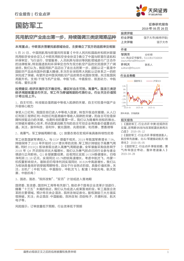 【天风证券】【20190526】国防军工行业点评:民用航空产业走出第一步,持续强调三类逆周期品种-3页