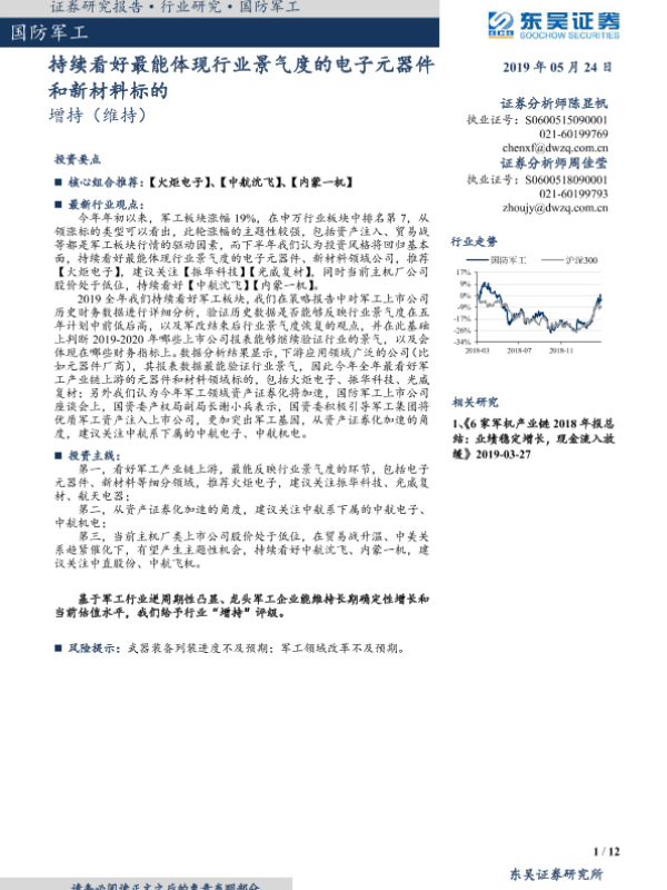 【东吴证券】【20190524】20190524-东吴证券-国防军工行业研究:持续看好最能体现行业景气度的电子元器件和新材料标的-12页