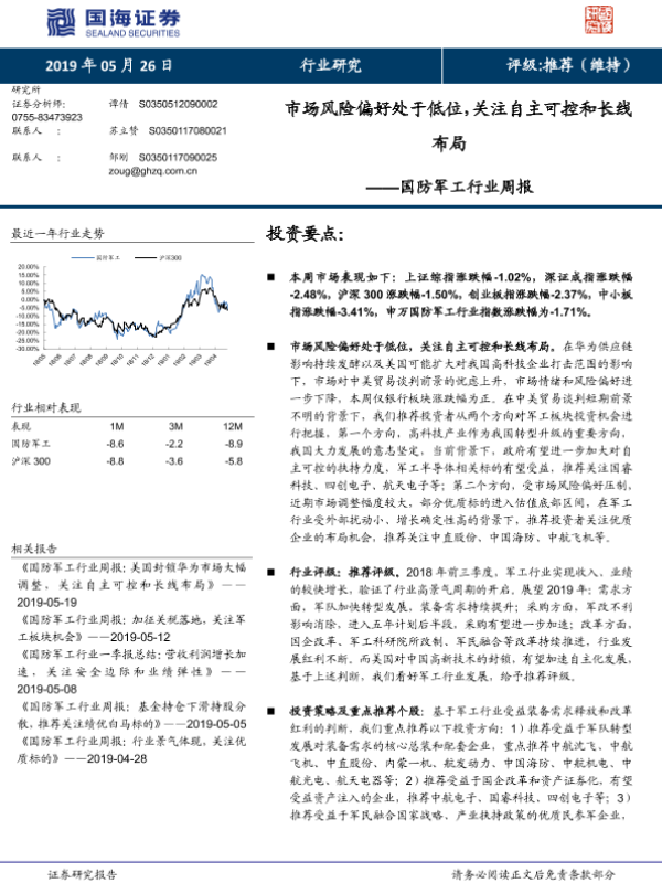 【国海证券】【20190526】20190526-国海证券-国防军工行业周报:市场风险偏好处于低位,关注自主可控和长线布局-14页