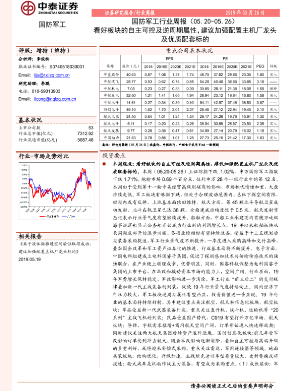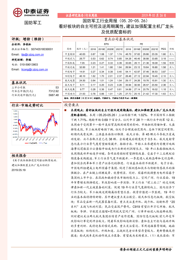 【中泰证券】【20190526】20190526-中泰证券-国防军工行业周报:看好板块的自主可控及逆周期属性,建议加强配置主机厂龙头及优质配套标的-12页