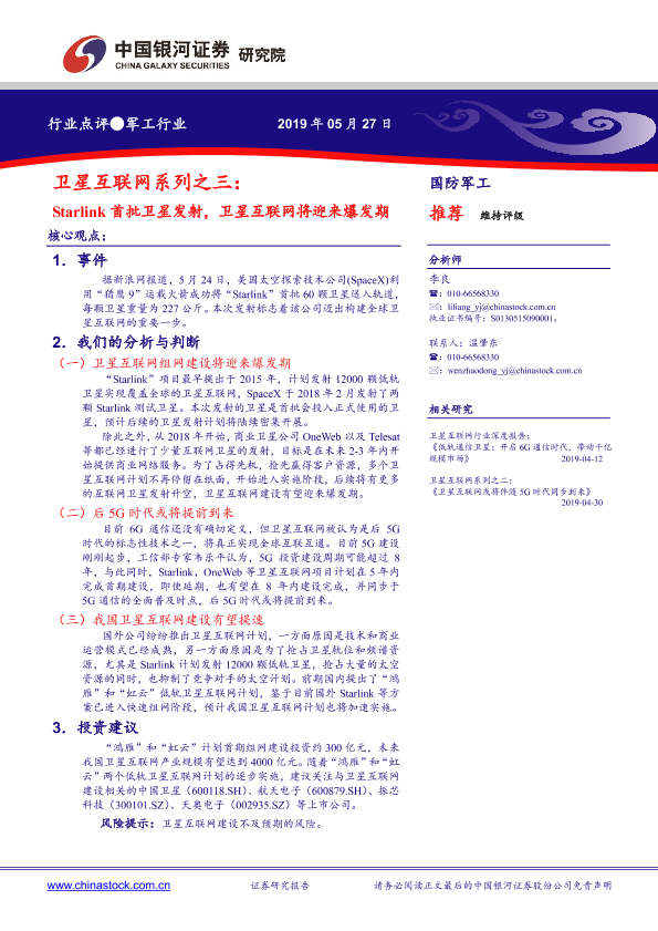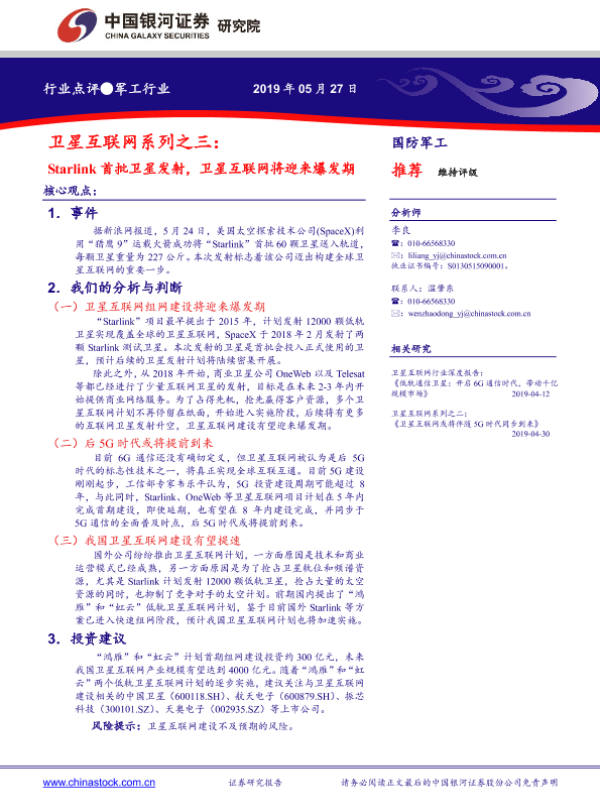 【银河证券】【20190527】卫星互联网系列之三:Starlink首批卫星发射,卫星互联网将迎来爆发期-3页