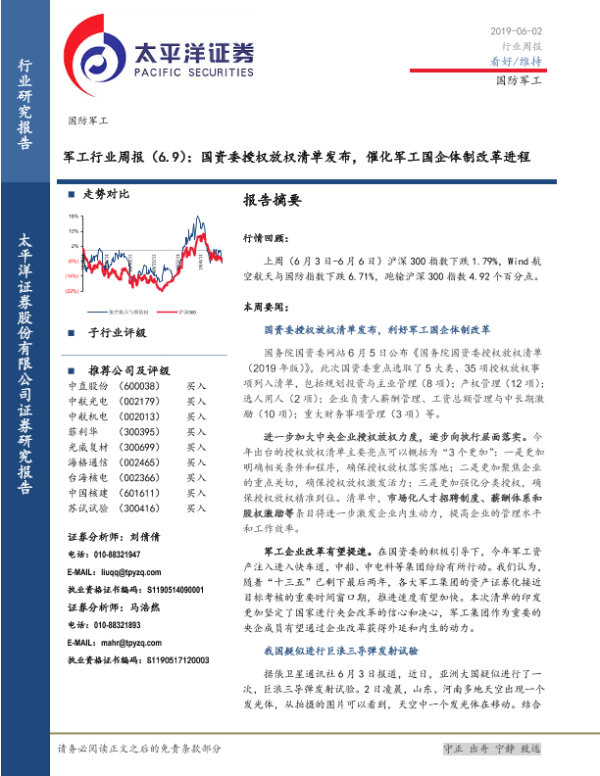 【太平洋证券】【20190602】军工行业周报(6.9):国资委授权放权清单发布,催化军工国企体制改革进程-20页