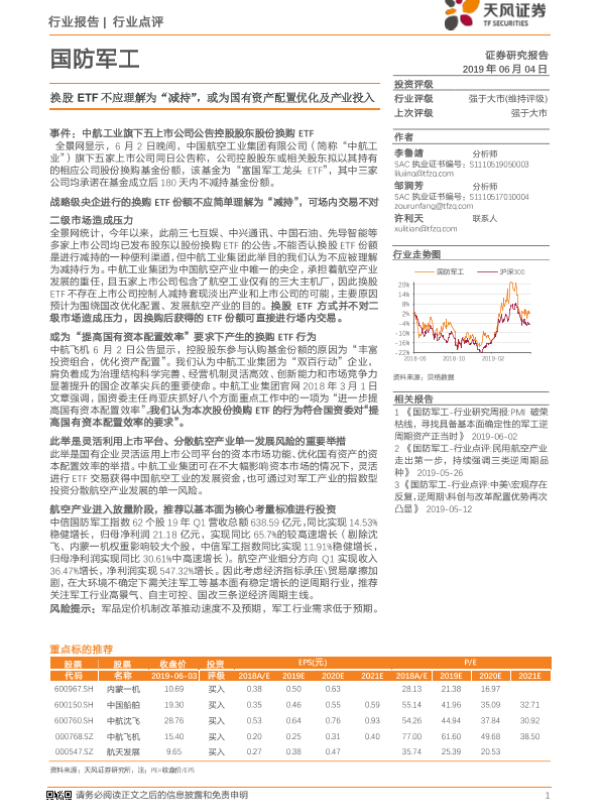 【天风证券】【20190604】国防军工行业点评:换股ETF不应理解为“减持”,或为国有资产配置优化及产业投入-2页