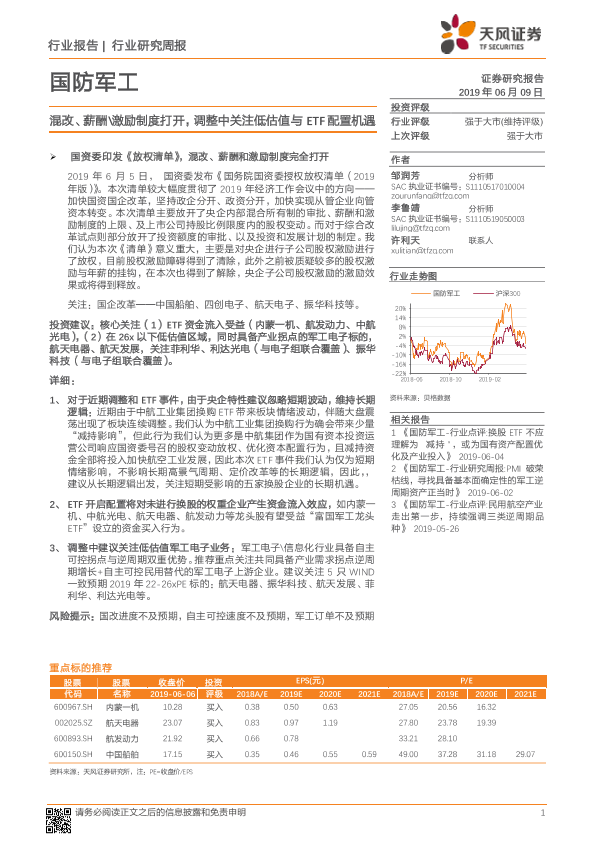 【天风证券】【20190609】国防军工行业研究周报:混改、薪酬激励制度打开,调整中关注低估值与ETF配置机遇-2页