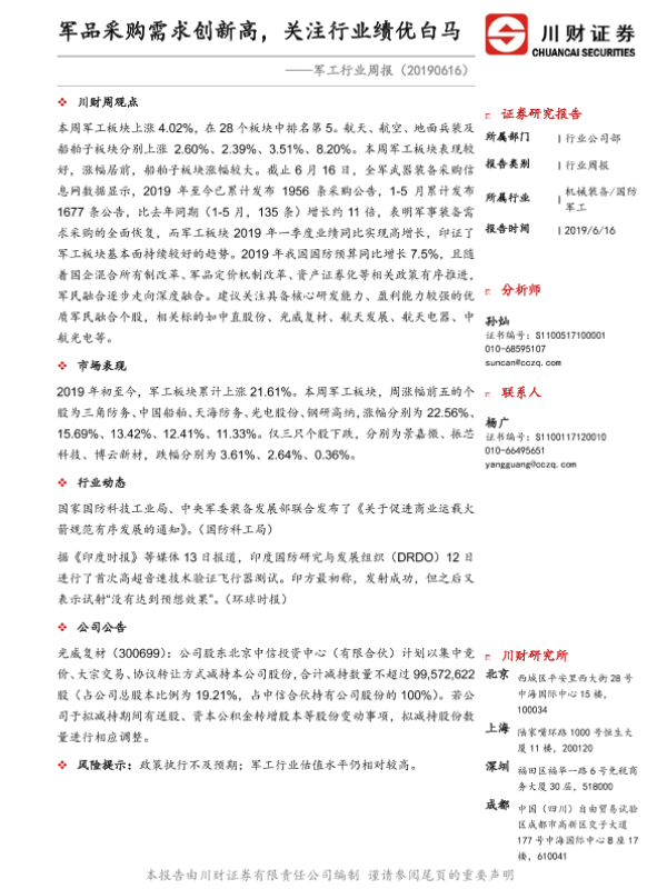 【川财证券】【20190616】军工行业周报:军品采购需求创新高,关注行业绩优白马-10页