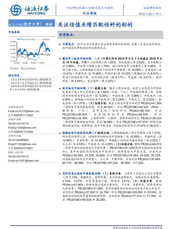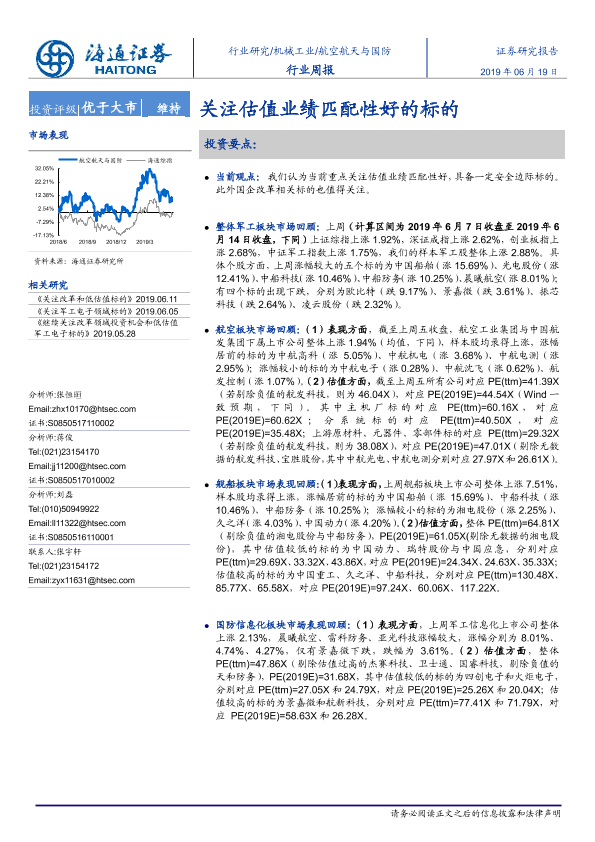 【海通证券】【20190619】20190619-海通证券-航空航天与国防行业周报:关注估值业绩匹配性好的标的-4页