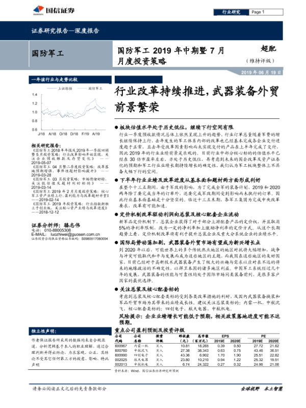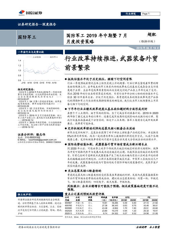 【国信证券】【20190619】国防军工2019年中期暨7月月度投资策略:行业改革持续推进,武器装备外贸前景繁荣-24页