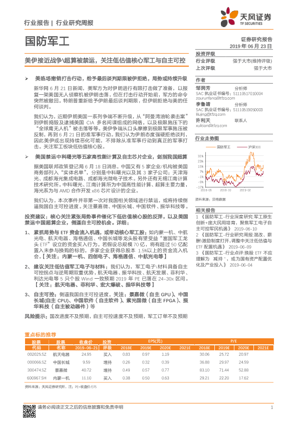 【天风证券】【20190623】国防军工行业研究周报:美伊接近战争 超算被禁运,关注低估值核心军工与自主可控-2页