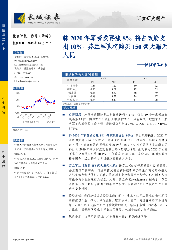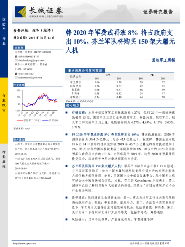 【长城证券】【20190623】20190623-长城证券-国防军工周报:韩2020年军费或再涨8% 将占政府支出10%,芬兰军队将购买150架大疆无人机-13页