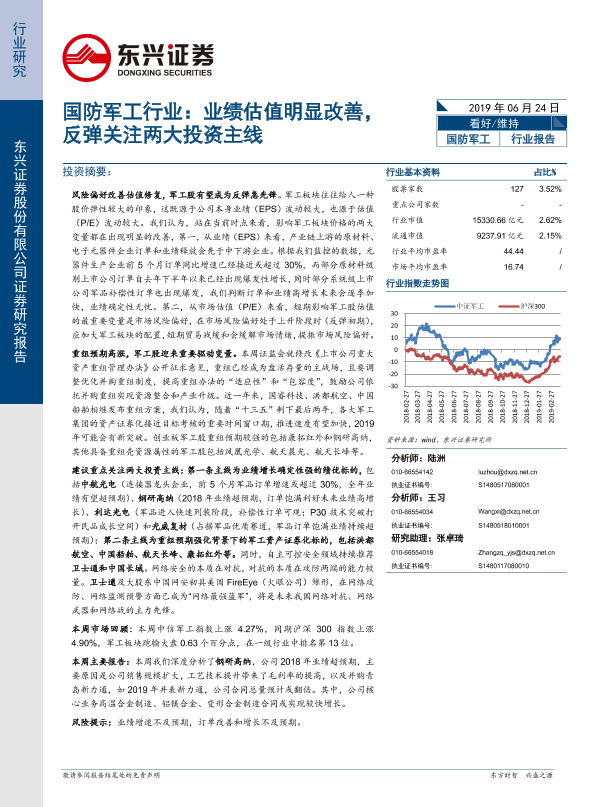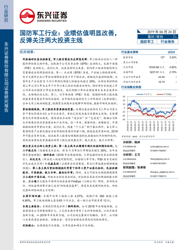 【东兴证券】【20190624】国防军工行业:业绩估值明显改善,反弹关注两大投资主线-8页