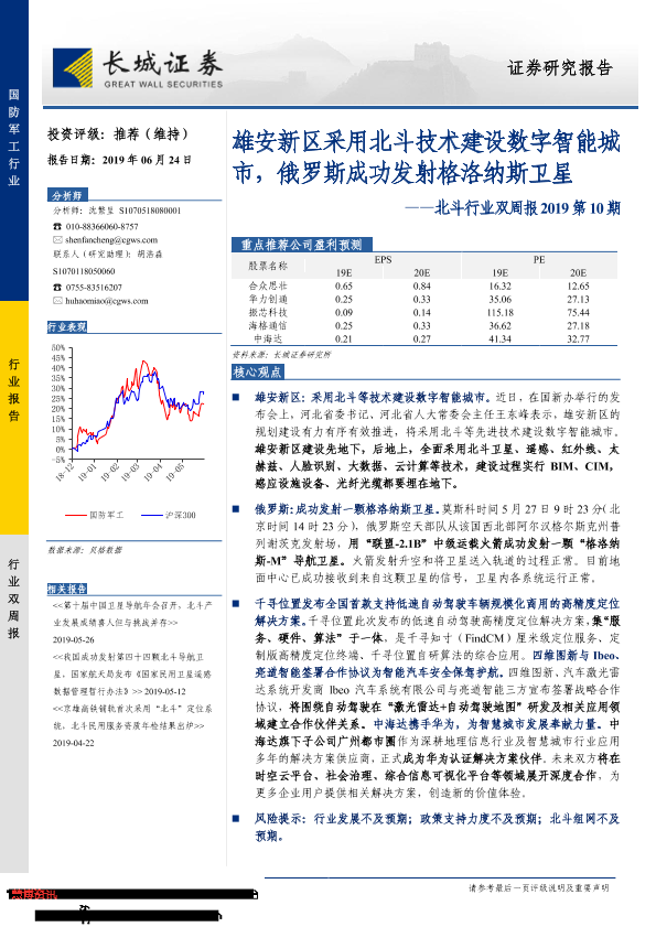 【长城证券】【20190624】20190624-长城证券-北斗行业双周报2019第10期:雄安新区采用北斗技术建设数字智能城市,俄罗斯成功发射格洛纳斯卫星-13页