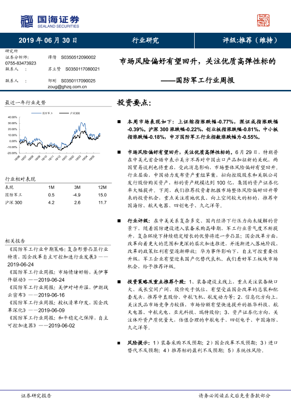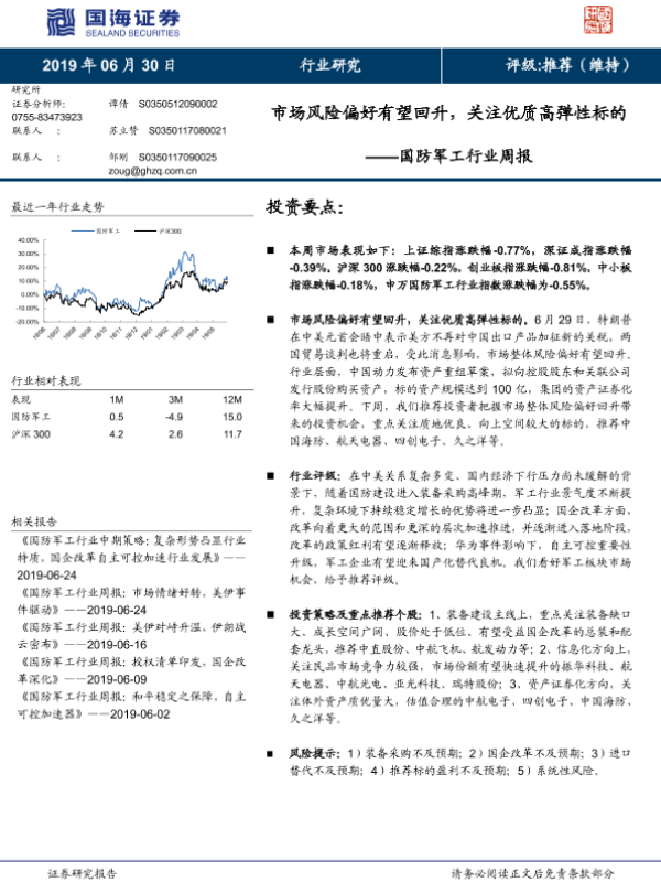 【国海证券】【20190630】国防军工行业周报:市场风险偏好有望回升,关注优质高弹性标的-14页