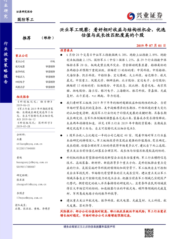 【兴业证券】【20190701】兴业军工观察:看好相对收益与结构性机会,优选估值与成长性匹配度高的个股-4页