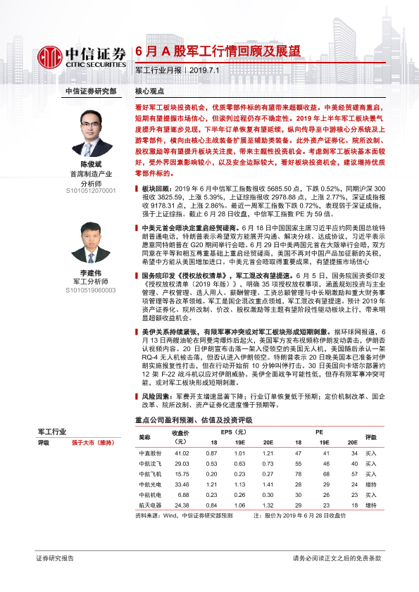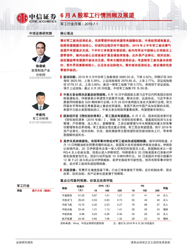 【中信证券】【20190701】20190701-中信证券-军工行业月报:6月A股军工行情回顾及展望-18页