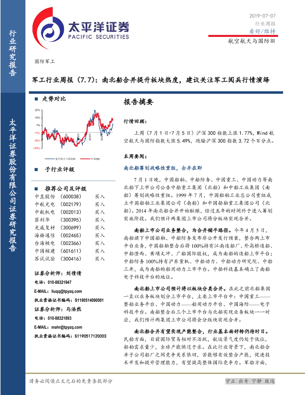 【太平洋证券】【20190707】军工行业周报:南北船合并提升板块热度,建议关注军工阅兵行情演绎-23页