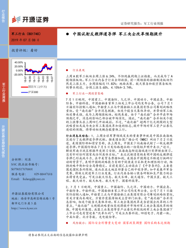 【开源证券】【20190708】20190708-开源证券-军工行业周报:中国试射反舰弹道导弹 军工央企改革预期提升-14页