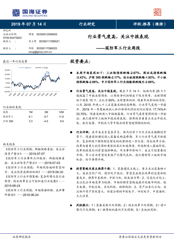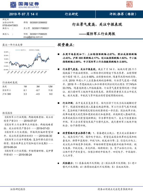 【国海证券】【20190714】国防军工行业周报:行业景气度高,关注中报表现-12页