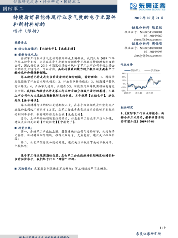【东吴证券】【20190721】国防军工:持续看好最能体现行业景气度的电子元器件和新材料标的-9页