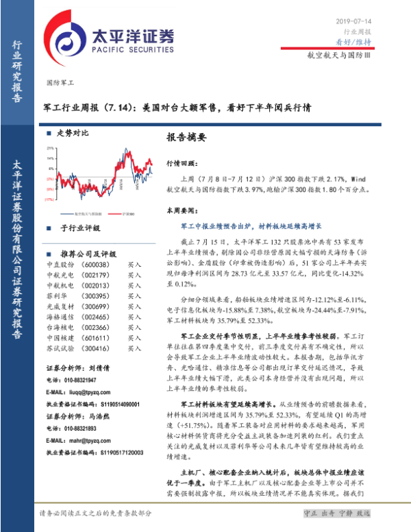【太平洋证券】【20190714】军工行业周报:美国对台大额军售,看好下半年阅兵行情-33页