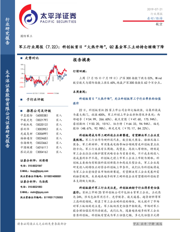 【太平洋证券】【20190721】军工行业周报:科创板首日“火热开场”,Q2基金军工主动持仓继续下降-22页