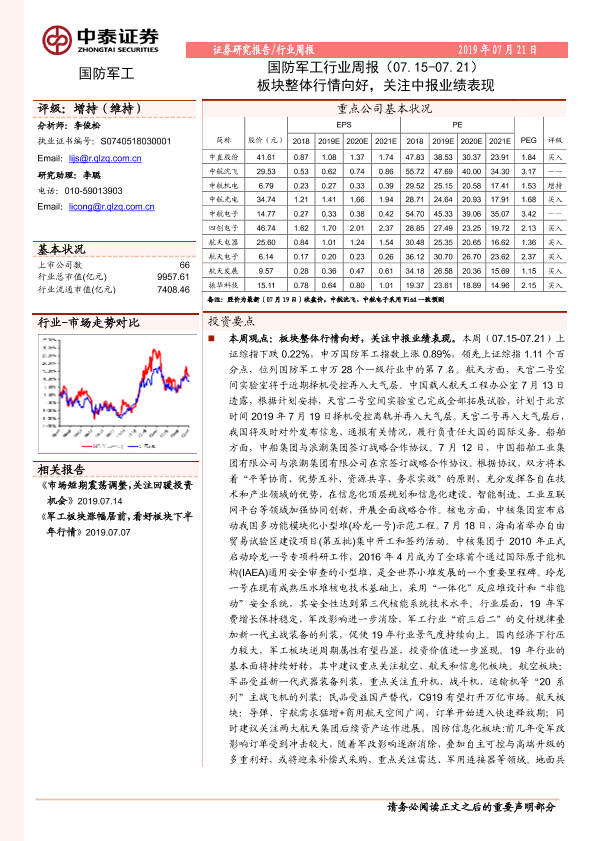 【中泰证券】【20190721】国防军工行业周报:板块整体行情向好,关注中报业绩表现-14页