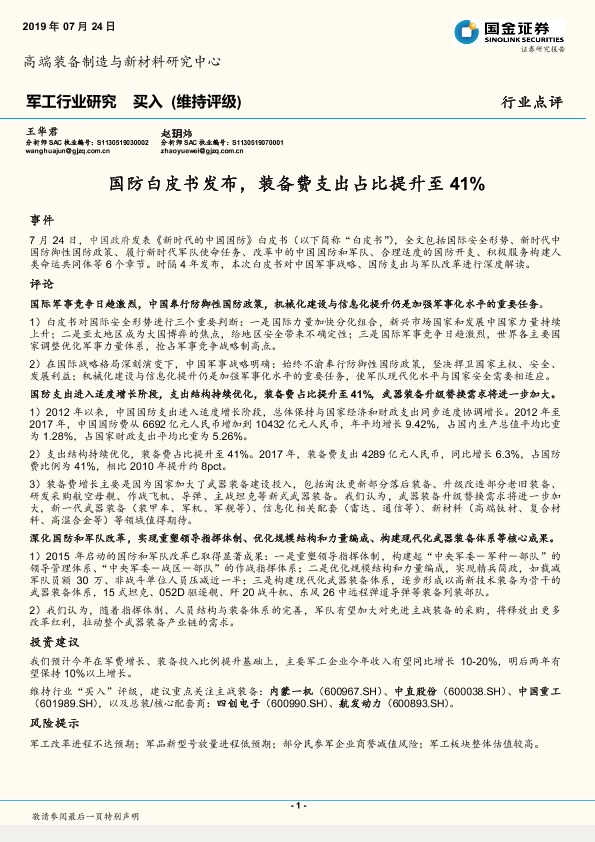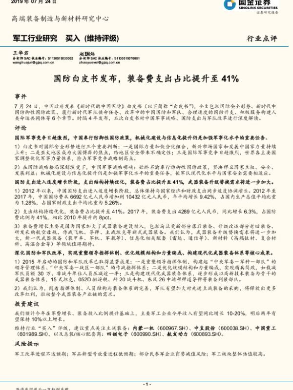 【国金证券】【20190724】20190724-国金证券-军工行业点评:国防白皮书发布,装备费支出占比提升至41%-6页