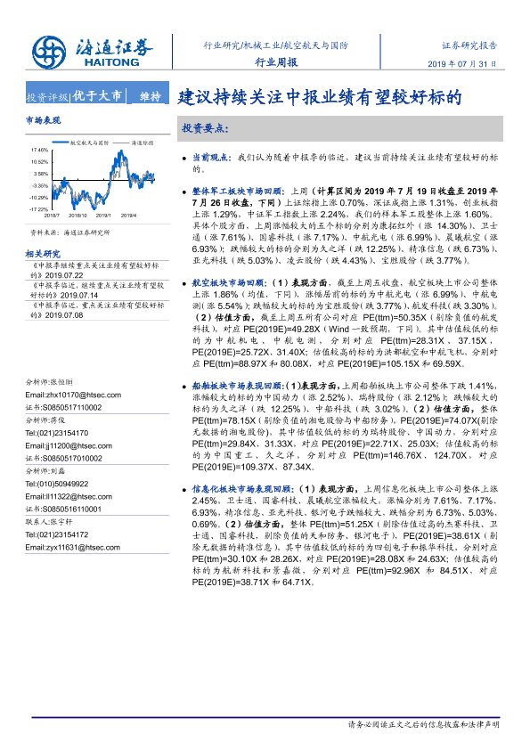 【海通证券】【20190731】20190731-海通证券-航空航天与国防行业周报:建议持续关注中报业绩有望较好标的-4页