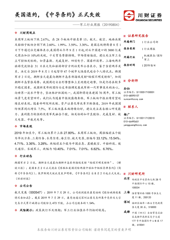 【川财证券】【20190804】20190804-川财证券-军工行业周报:美国退约,《中导条约》正式失效-10页