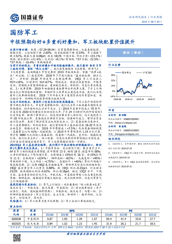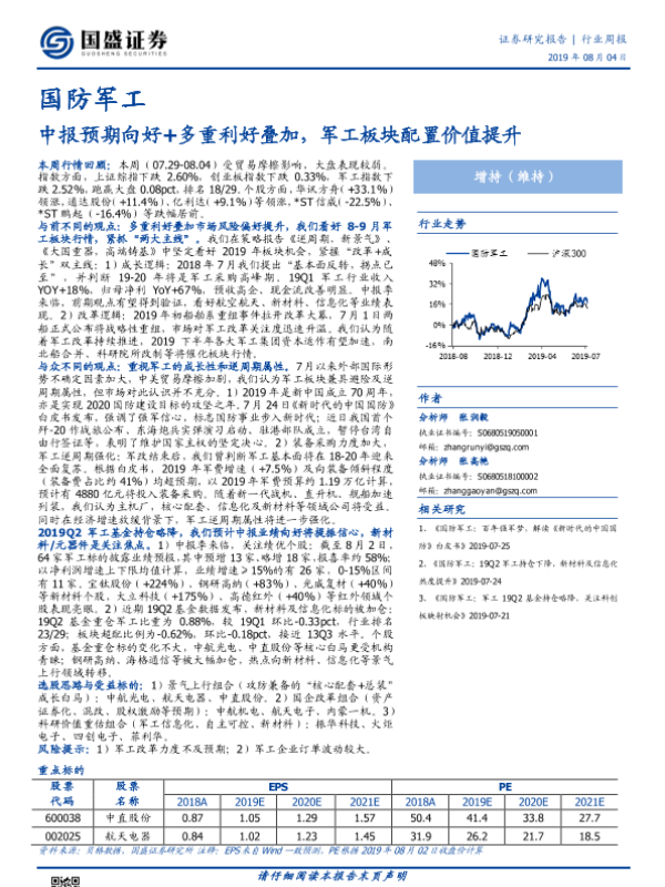 【国盛证券】【20190804】国防军工行业周报:中报预期向好+多重利好叠加,军工板块配置价值提升-19页