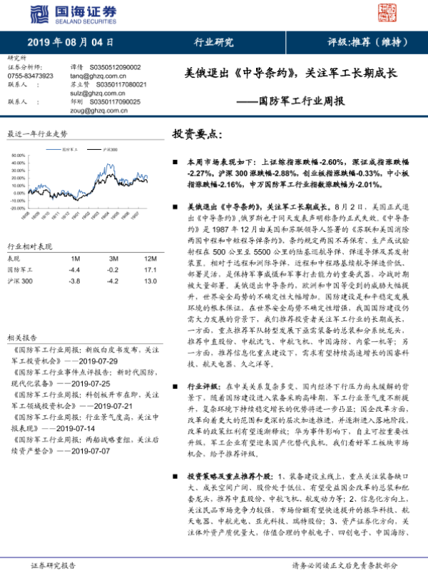 【国海证券】【20190804】20190804-国海证券-国防军工行业周报:美俄退出《中导条约》,关注军工长期成长-12页