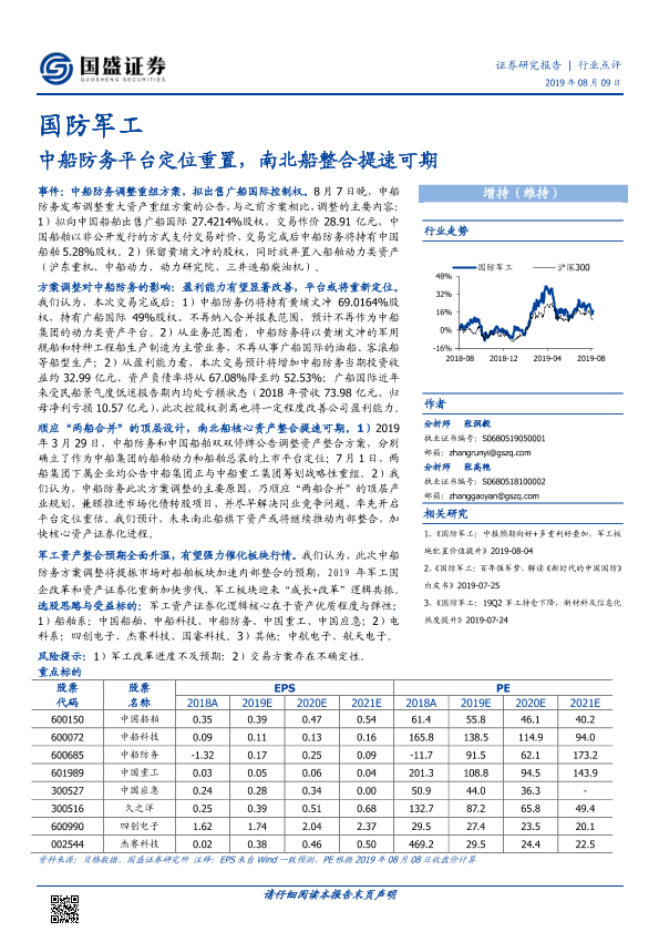 【国盛证券】【20190809】国防军工行业点评:中船防务平台定位重置,南北船整合提速可期-4页