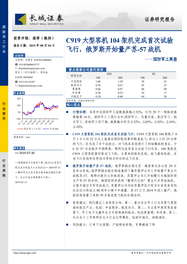 【长城证券】【20190804】20190804-长城证券-国防军工周报:C919大型客机104架机完成首次试验飞行,俄罗斯开始量产苏-57战机-16页