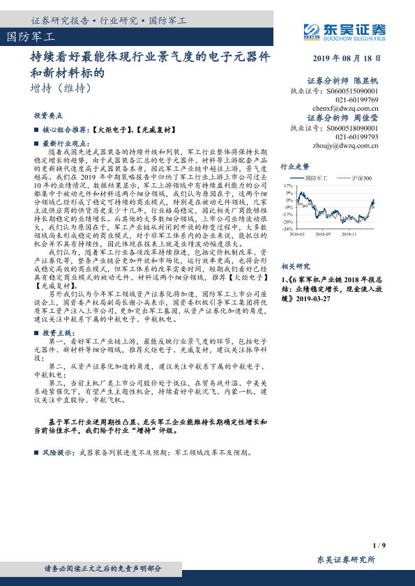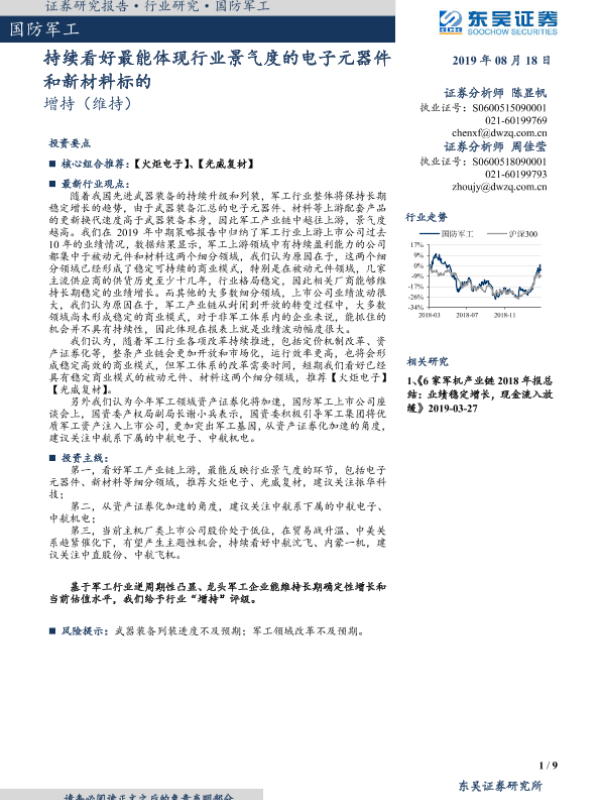 【东吴证券】【20190818】国防军工:持续看好最能体现行业景气度的电子元器件和新材料标的-9页