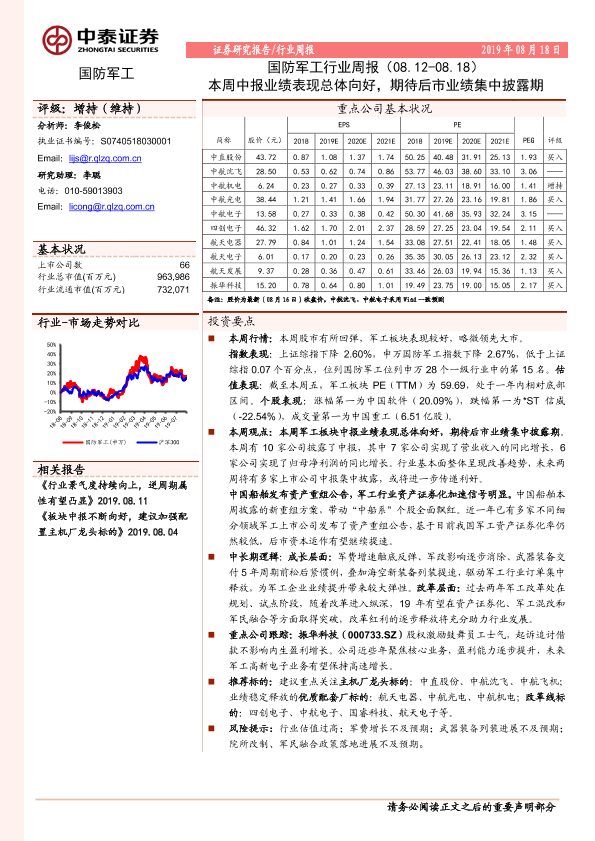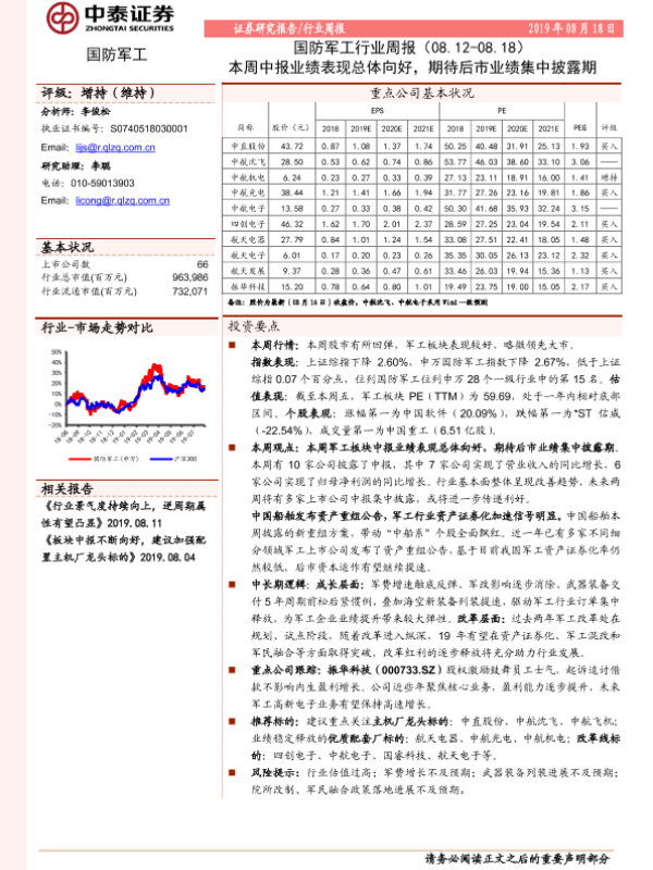 【中泰证券】【20190818】20190818-中泰证券-国防军工行业周报:本周中报业绩表现总体向好,期待后市业绩集中披露期-14页