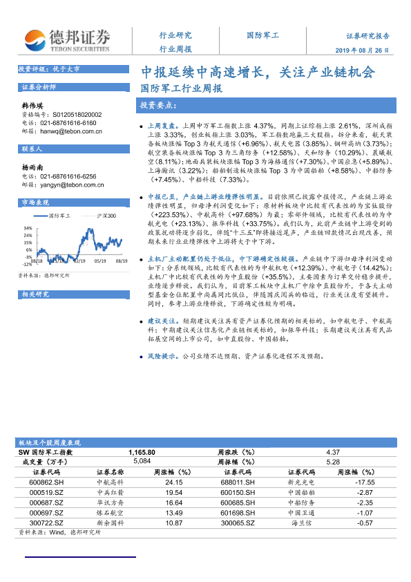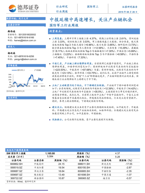 【德邦证券】【20190826】20190826-德邦证券-国防军工行业周报:中报延续中高速增长,关注产业链机会-5页