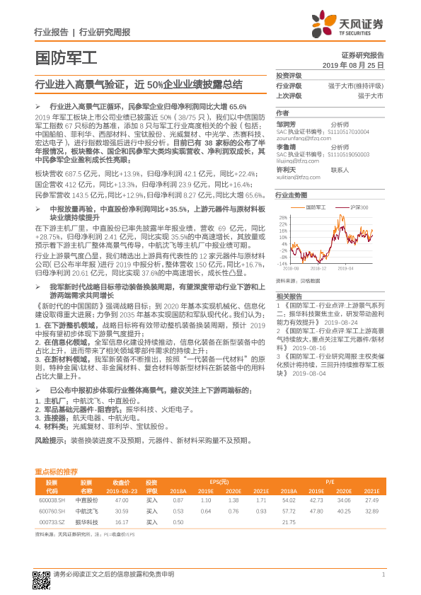 【天风证券】【20190825】国防军工行业研究周报:行业进入高景气验证,近50%企业业绩披露总结-3页