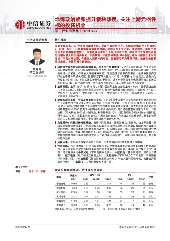 【中信证券】【20190827】20190827-中信证券-军工行业周聚焦:地缘政治紧张提升板块热度,关注上游元器件标的投资机会-20页