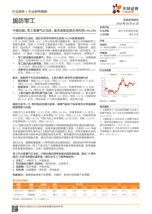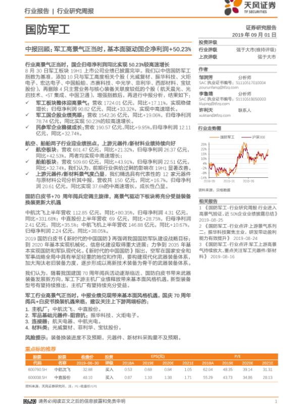 【天风证券】【20190901】国防军工行业研究周报:中报回顾:军工高景气正当时,基本面驱动国企净利润+50.23%-3页