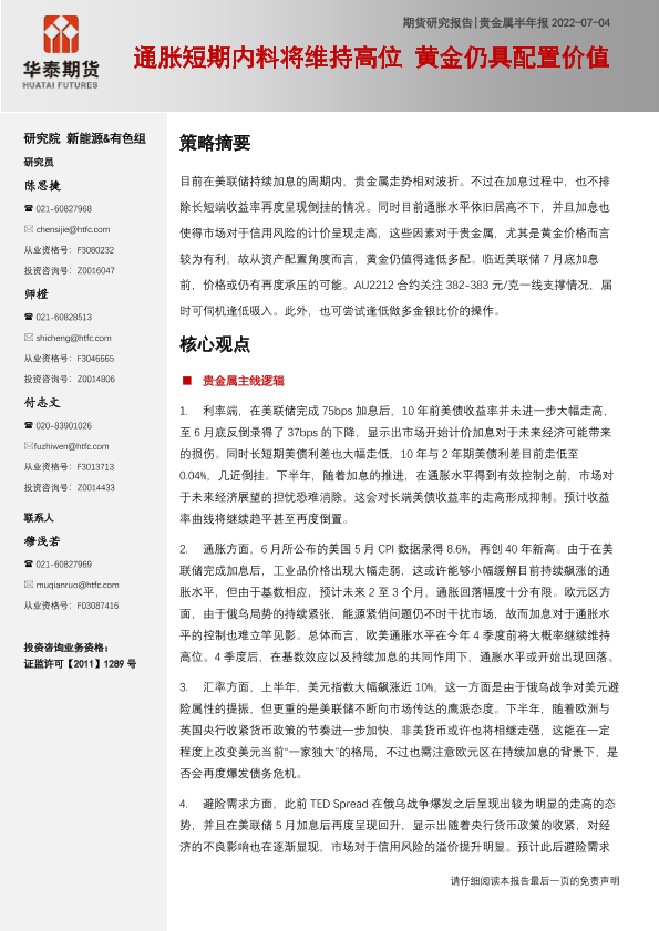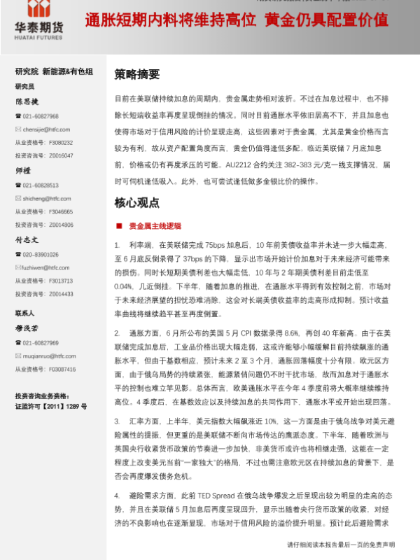 【华泰期货】【20220704】贵金属半年报:通胀短期内料将维持高位,黄金仍具配置价值-20页