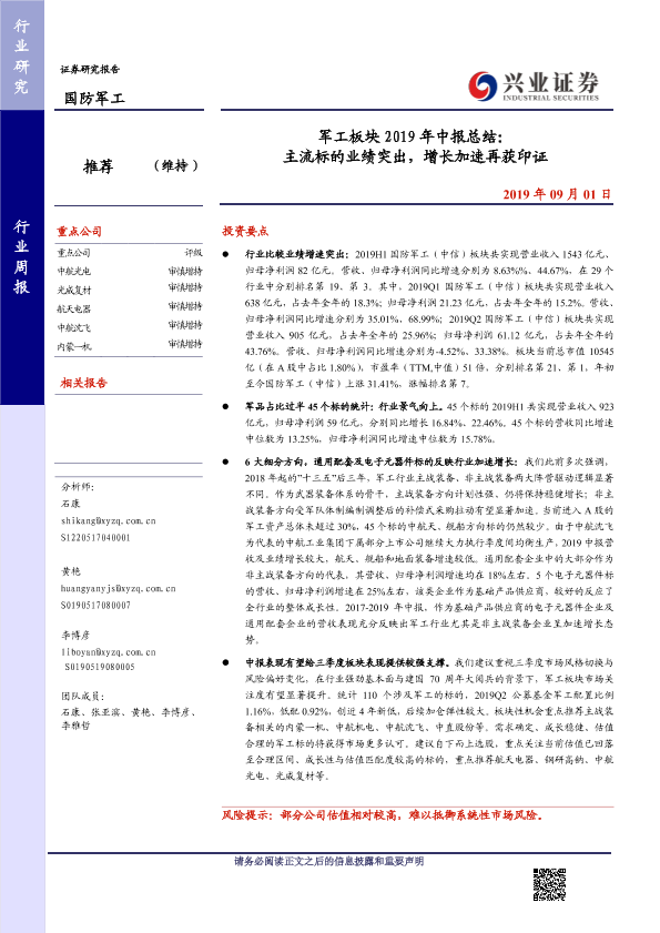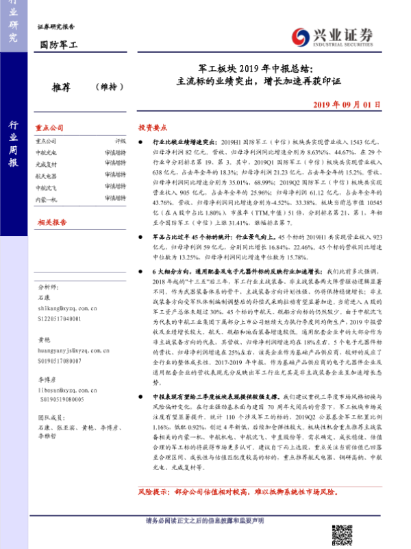 【兴业证券】【20190901】军工板块2019年中报总结:主流标的业绩突出,增长加速再获印证-8页