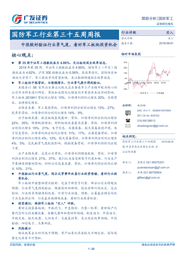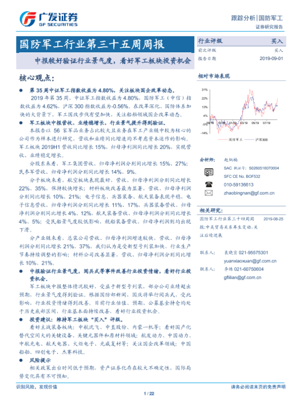【广发证券】【20190901】国防军工行业第三十五周周报:中报较好验证行业景气度,看好军工板块投资机会-22页