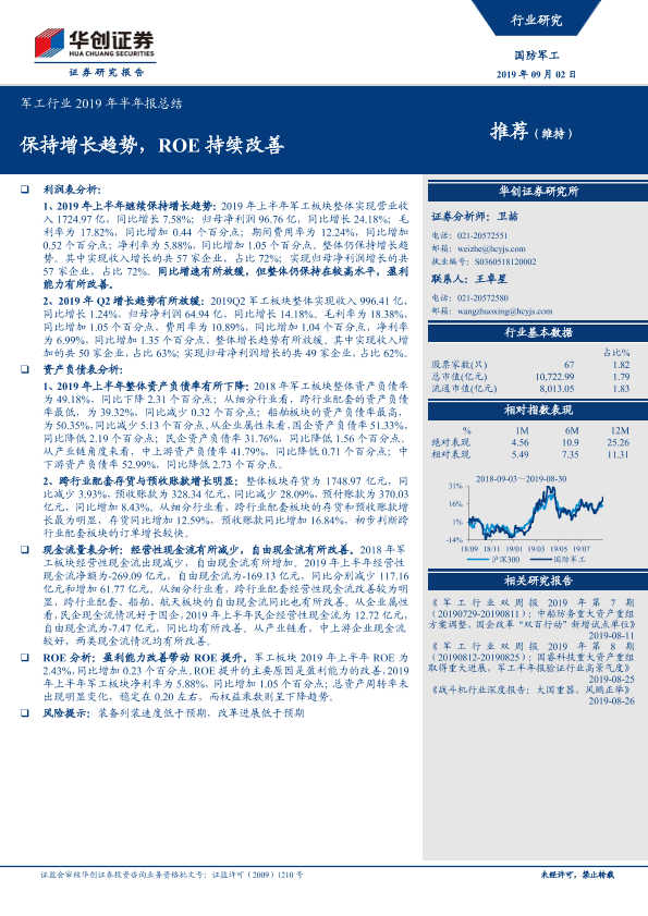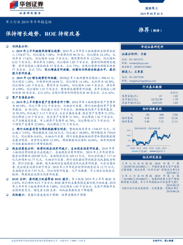 【华创证券】【20190902】军工行业2019年半年报总结:保持增长趋势,ROE持续改善-27页