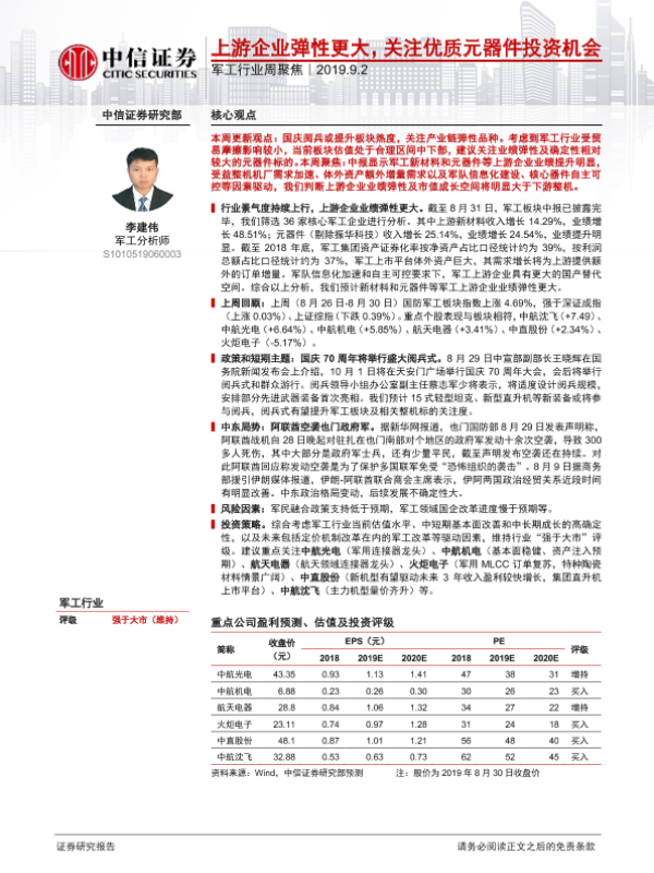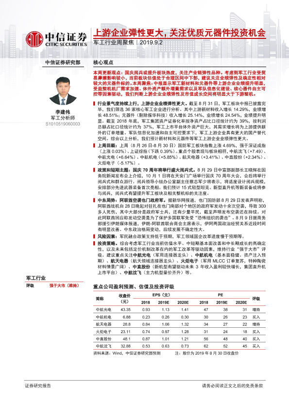 【中信证券】【20190902】军工行业周聚焦:上游企业弹性更大,关注优质元器件投资机会-15页