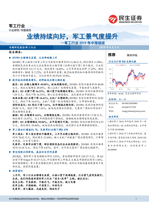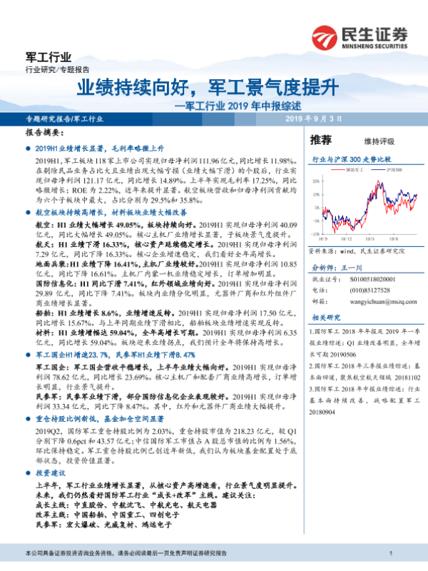 【民生证券】【20190903】军工行业2019年中报综述:业绩持续向好,军工景气度提升-15页