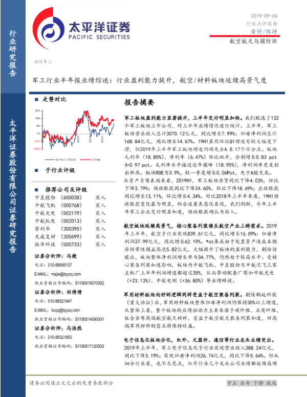 【太平洋证券】【20190904】军工行业半年报业绩综述:行业盈利能力提升,航空材料板块延续高景气度-17页