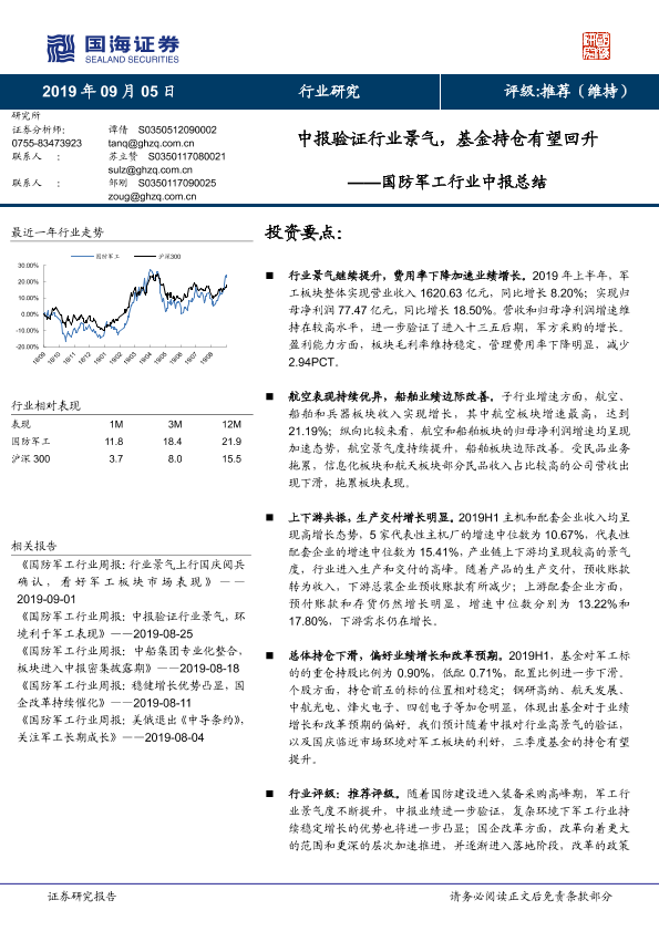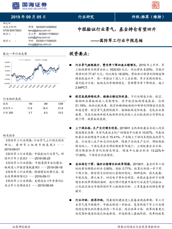 【国海证券】【20190905】国防军工行业中报总结:中报验证行业景气,基金持仓有望回升-13页