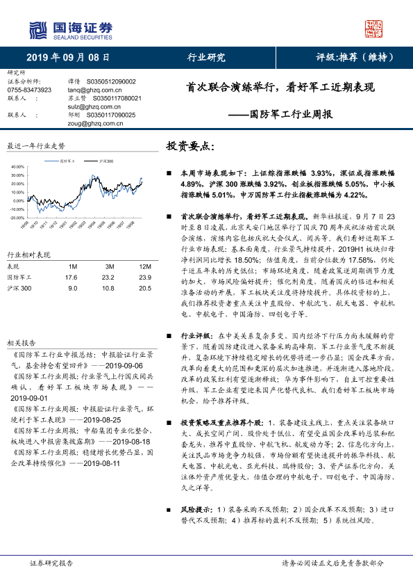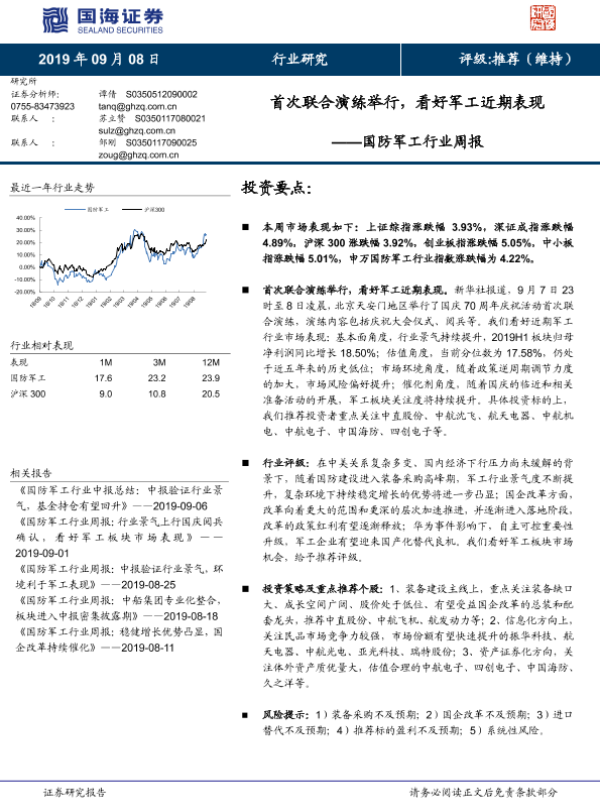 【国海证券】【20190908】国防军工行业周报:首次联合演练举行,看好军工近期表现-12页