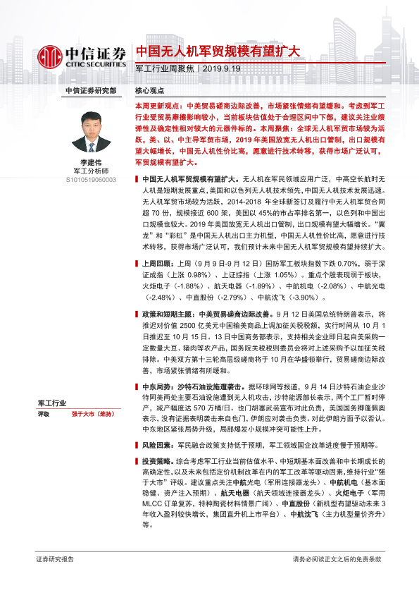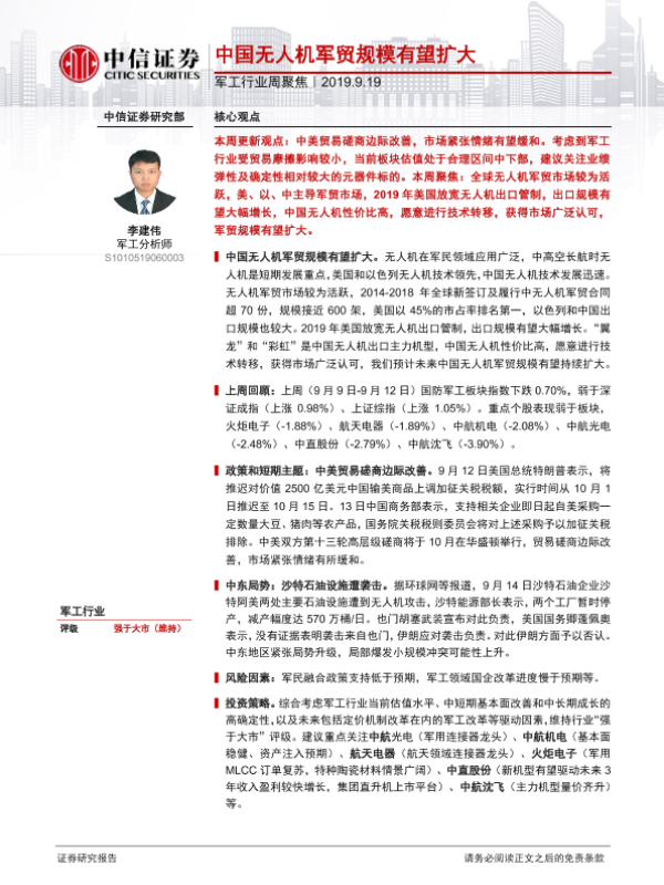 【中信证券】【20190919】20190919-中信证券-军工行业周聚焦:中国无人机军贸规模有望扩大-19页