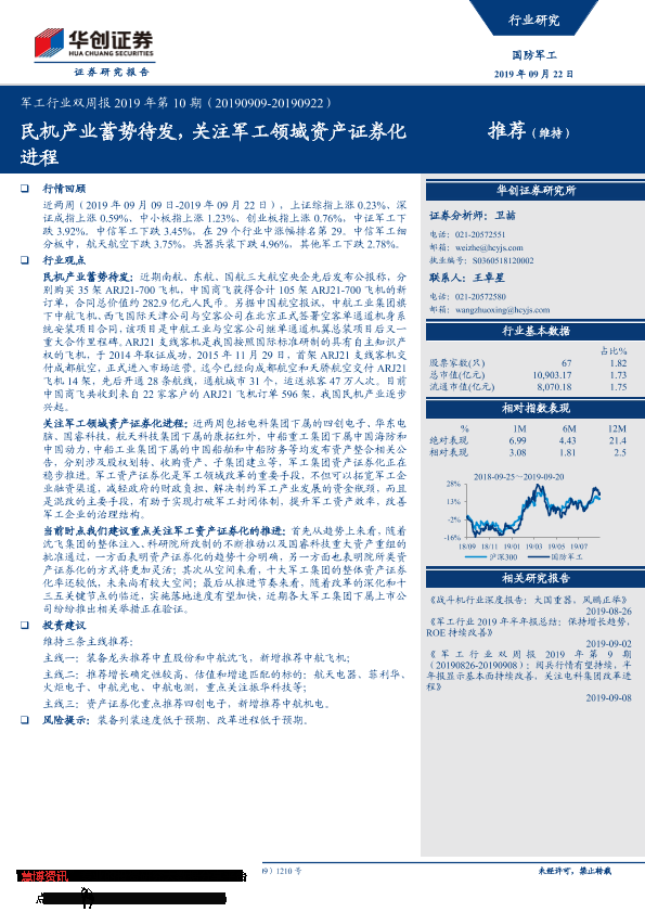 【华创证券】【20190922】军工行业双周报2019年第10期:民机产业蓄势待发,关注军工领域资产证券化进程-22页