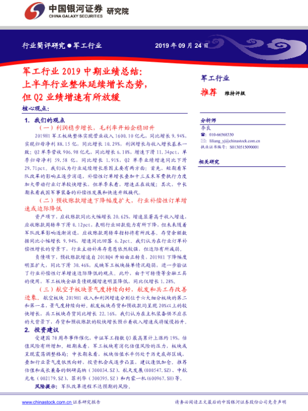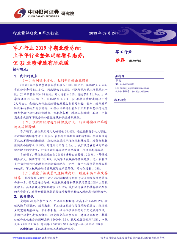 【银河证券】【20190924】军工行业2019中期业绩总结:上半年行业整体延续增长态势,但Q2业绩增速有所放缓-9页